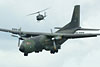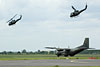 Transall beim Start, beschützt durch zwei UH-1D